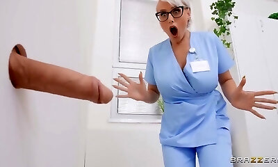 le gros cul aux cheveux noirs travaille comme infirmière et utilise toutes les chances pour obtenir une bonne charrue