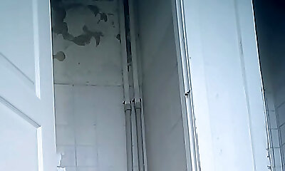 White blondie in the shabby toilet apartment getting filmed on spycam